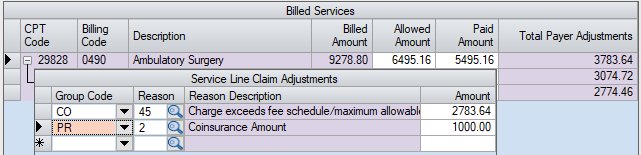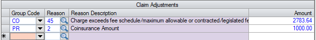 by each line item to open individual claim adjustment grids. This is where CARC (Claim Adjustment Reason Codes) are entered or can be reviewed.