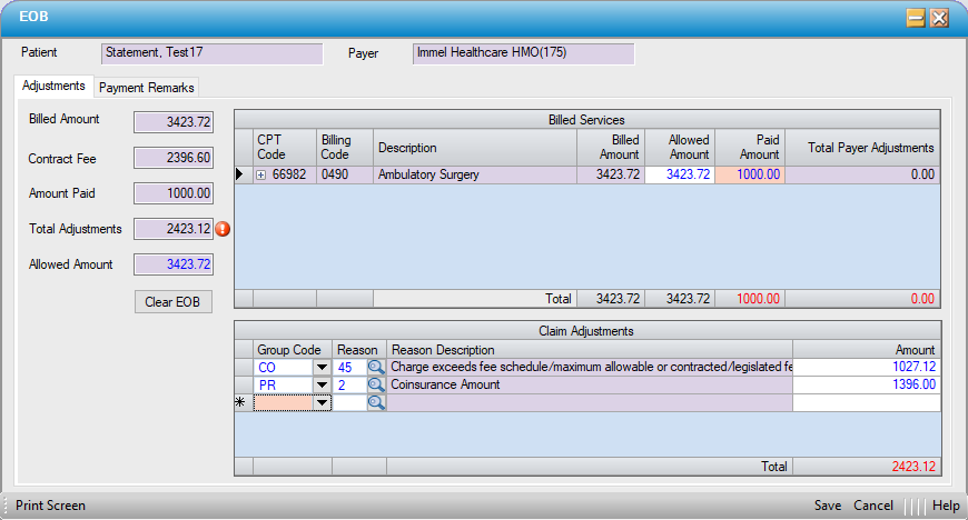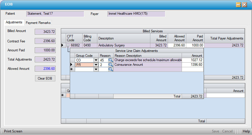 - Enter the Group Code, Reason and Amount for each service line that the paper remit has listed for the CPT Code. For Example:
