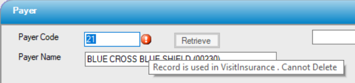 NOTE: It is not possible to delete a Payer that has been attached to visits in HST. A red error ball will appear with a hover message explaining why the Payer cannot be deleted. The Payer would need to be removed from every case to which it is attached to proceed with the deletion. Best Practice is to Inactivate rather than deleting.