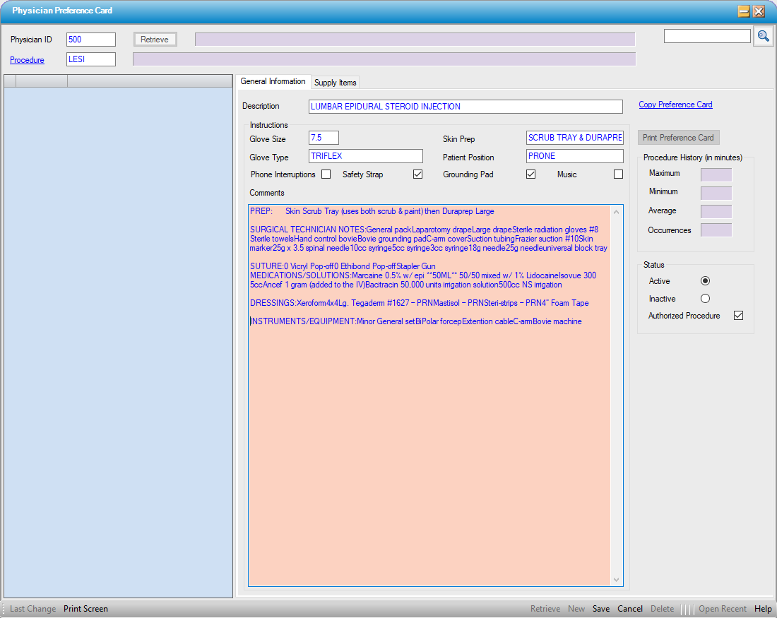 • Enter information for the Preference Card on the General Information tab.  These items are related to physician preferences as well as room and patient preparation.