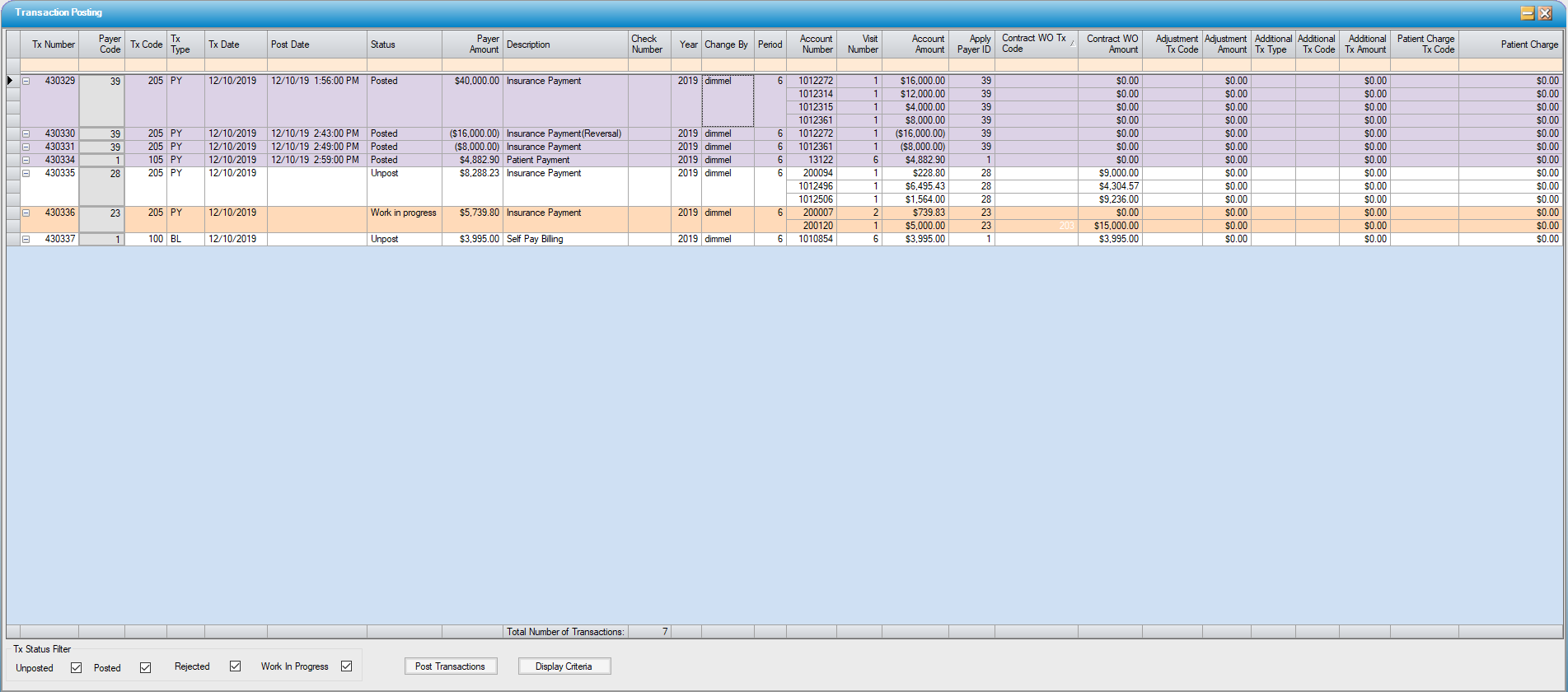 Tx Status Filter defaults to display Unposted, Rejected, and Work In Progress transactions. To see Posted transactions, manually check the Posted box.