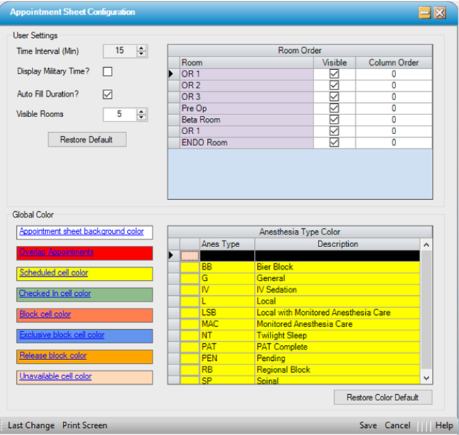 To open the Color selection window for Anesthesia Type Colors, click on the grey box to the left of the Anes Type.  The selected Anesthesia Type colors will display on the Appointment Sheet until the appointment is checked in, at which time the "Checked In cell color" will display.