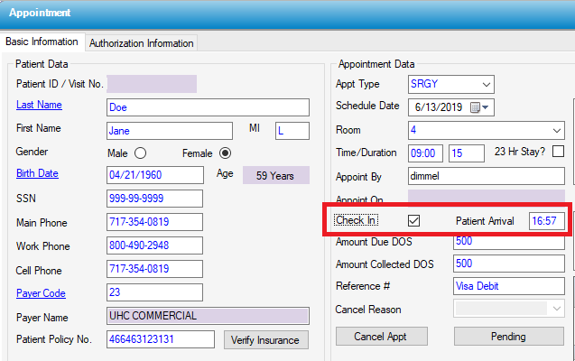 Select the Check In box. HST Practice Management will automatically insert the patient's arrival time as the current time when the patient is checked in, but it can also be manually entered.