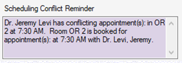 The Scheduling Conflict Reminder will indicate conflicts such as overlapping appointments or one piece of equipment, such as a C-Arm, being scheduled in more than one room at the same time.