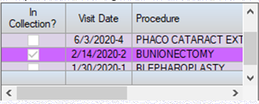The previous visits grid: In Collection? will also indicate if a previous visit(s) has been a assigned to Collections. The box in this column will be checked and that visit will be highlighted in violet in the grid.