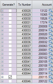 Check boxes in the Generate? column will default as checked unless the account cannot be identified (highlighted in yellow), in which case the box will not be checked. To exclude a transaction (such as the one that would create a credit balance in the example above), simply uncheck this box.