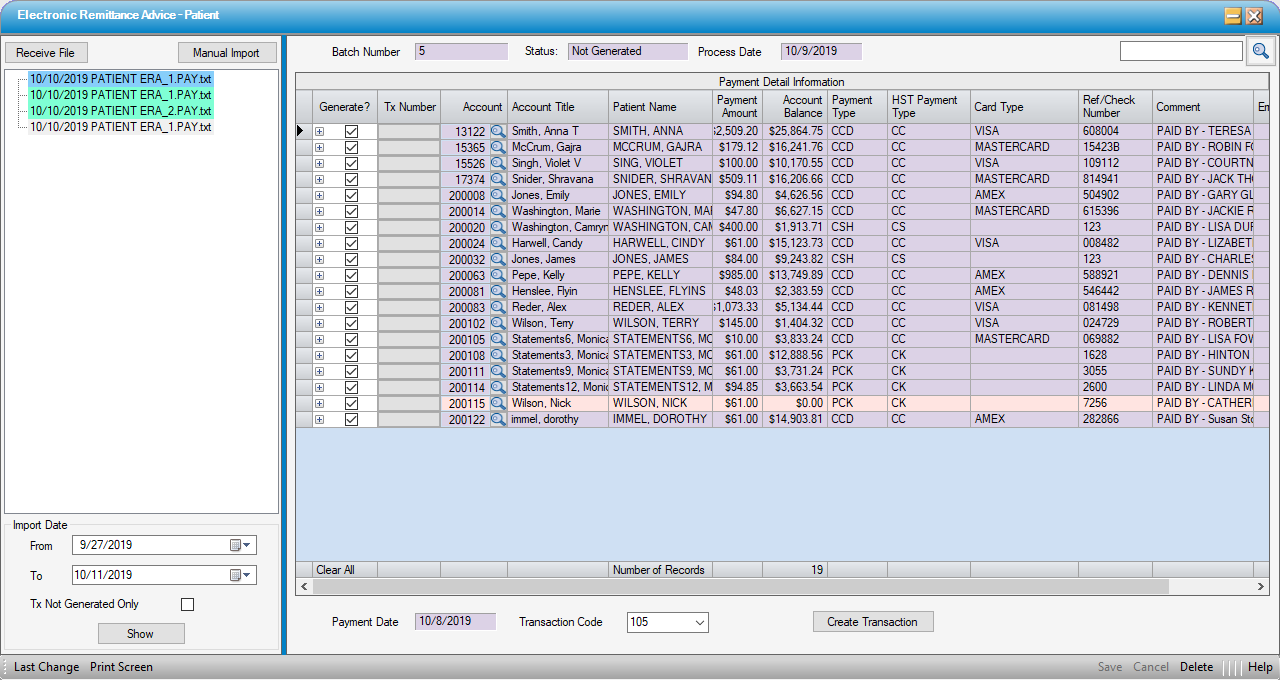 Transactions can be reviewed, edited, and posted individually via Payments and Adjustments (depending upon user permissions) or posted in bulk via Transaction Posting.