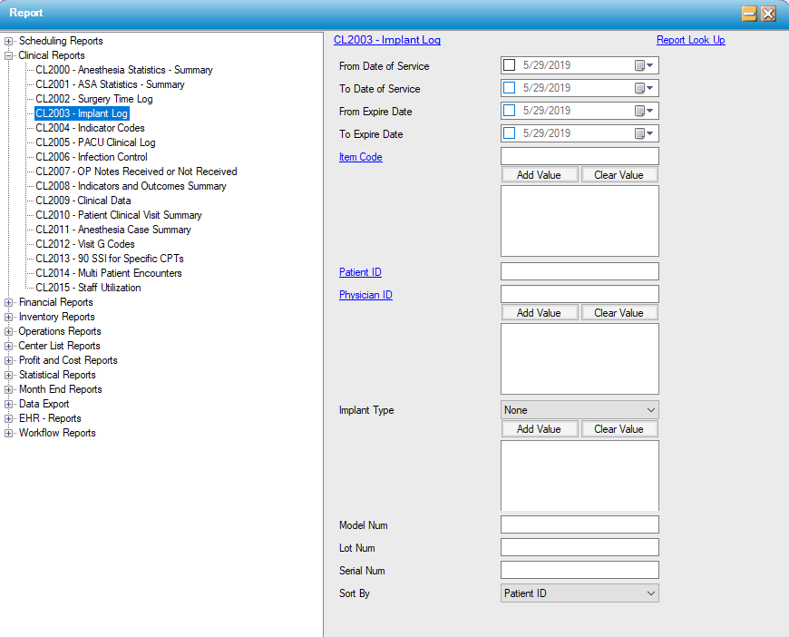 Run this report based on scheduled date range, expiration date range, specified Item Code(s), individual Patient ID or Physician ID(s). Filter by specific Model Number, Serial Number, or Lot Number of an individual implant if applicable.