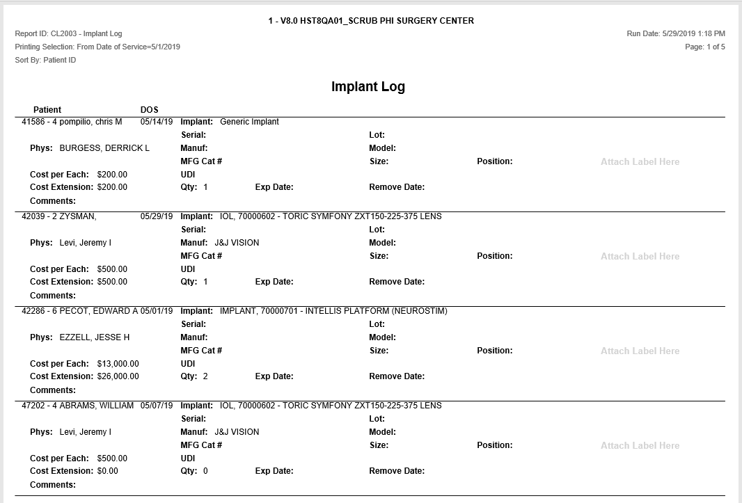 Provides full detail for each implant entered in Case History, Implant Log, for all cases within the specified inclusion criteria. There’s a marked location on the report to attach a label.