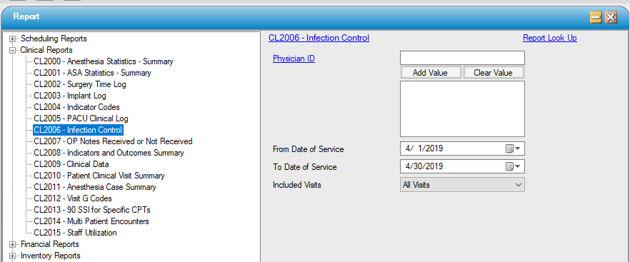 The report can be run by selected Physician ID(s) and/or by date of service range. Date of service range will default to last month. In addition, choose to filter the results for Implants - include all visits, only those with implants on the case, or exclude cases with implants if applicable.