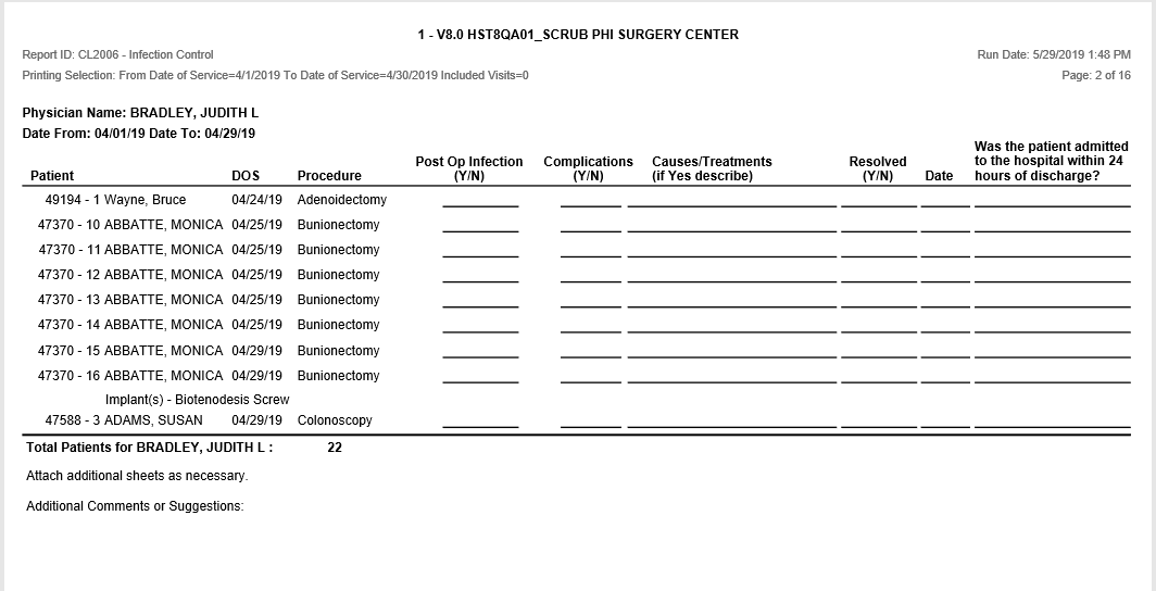 This is a simple summary of a physician’s cases for the month, listing patient identifiers, procedure information, and places for the physician to indicate whether an infection has occurred, whether complications occurred, possible causes/treatments, whether resolved, and a place for the physician signature.