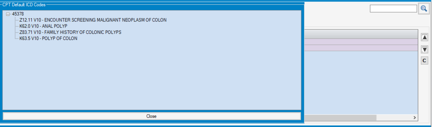 - If centers have insurance contracts that still require ICD Procedure Codes, the three most common ICD Procedure Codes can also be mapped to the CPT Code. The first code entered will default in Charge Entry. The additional codes will be available from the drop down. (If a code is required that was not entered here, select LookUp to find the correct code.)