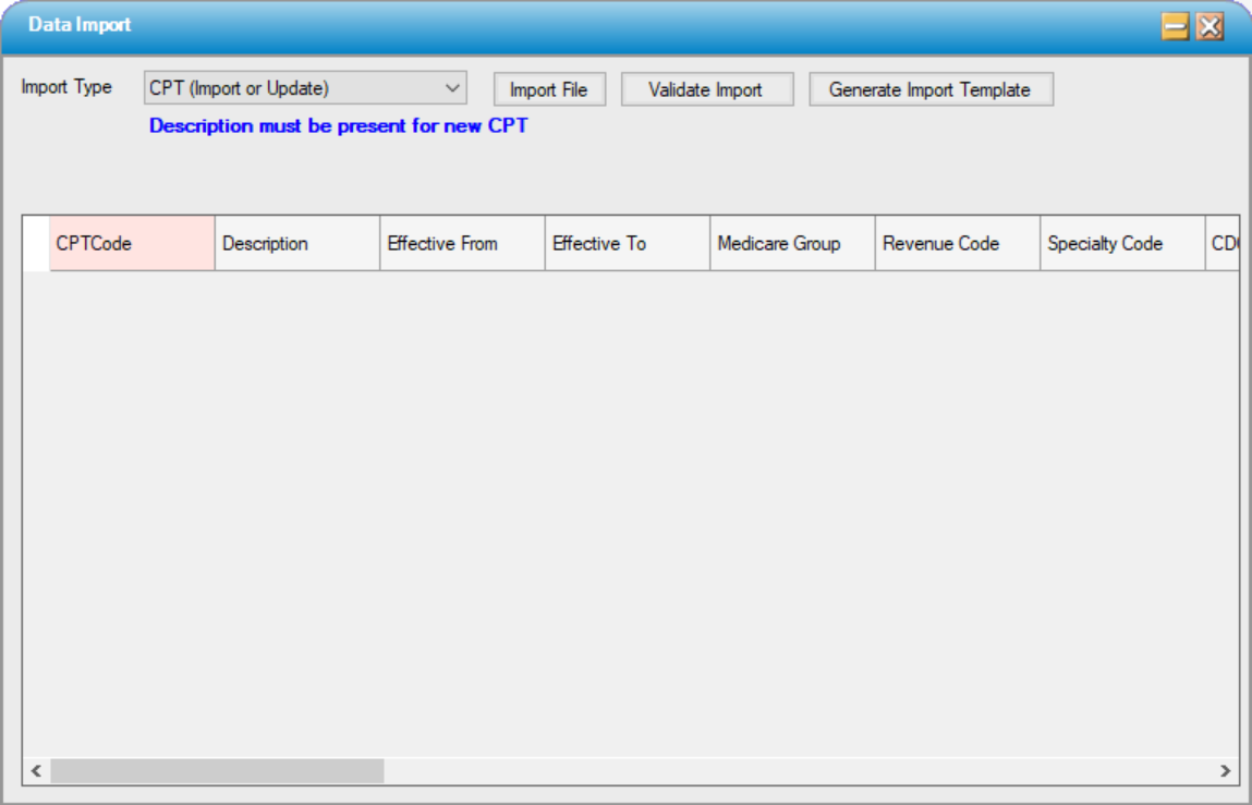 CPT Codes can also be entered and updated utilizing the Utility > Data Import > CPT (Import or Update) function.