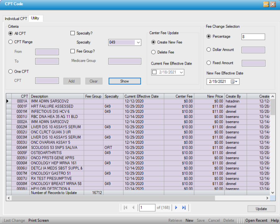 Practice Management provides the ability to make individual or comprehensive changes to CPT Code fees through the Utility tab.