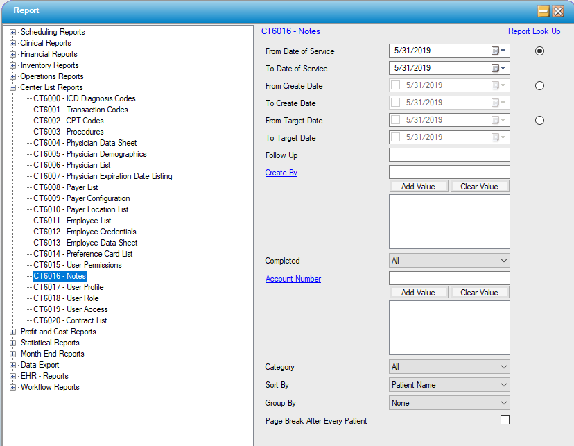 Notes are available in many areas of the system. This report will print all notes both user and system generated. Notes can be printed by category, target dates, assigned to, status, patient ID or account.