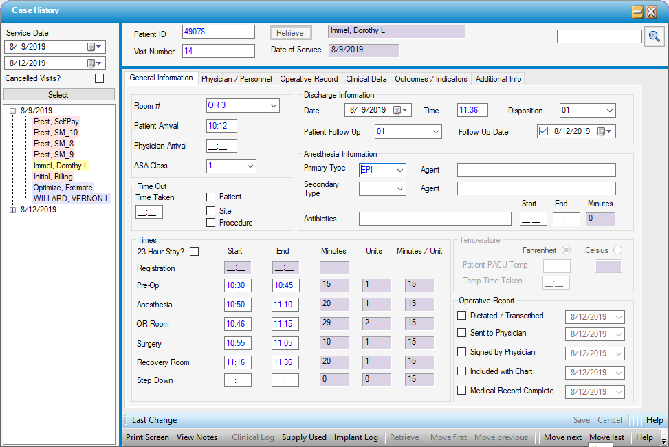 All relevant clinical data will be entered here including: in and out times, discharge data, op report/medical record completion, diagnosis codes (including pre-op or admitting diagnosis, G Codes (for benchmarking purposes), supplies used, and implant records.