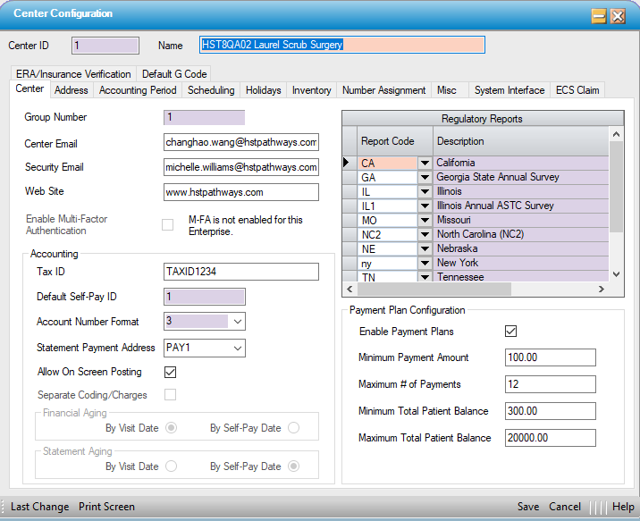 Most of Center Configuration will be addressed at the time that HST Practice Management is installed; there should be infrequent need to return to change values in this form.