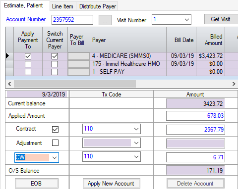If it is necessary to enter additional contractual write offs as a separate transaction, the third write off field in Payments and Adjustments allows for the selection of either AD (adjustment) or CW (contractual write off). Simply select CW, enter the appropriate Tx Code, and the Amount of the additional write off. In the example below, an additional contractual write off was entered for the Medicare Sequestration amount.