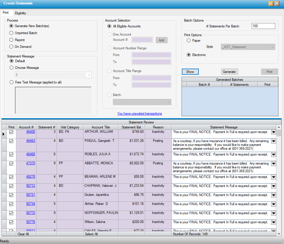 - When opened, this form will default to Generate New Batch(es), Default Statement Message, All Eligible Accounts, and - if center is set up for Electronic transmission of statements in the System Interface tab of Administration > Configuration > Center Configuration - the Electronic print option.