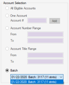 - When this radio dial is selected, the Account Selection will default to Batch, and any batches that were generated but not processed will be available for selection from the drop down.