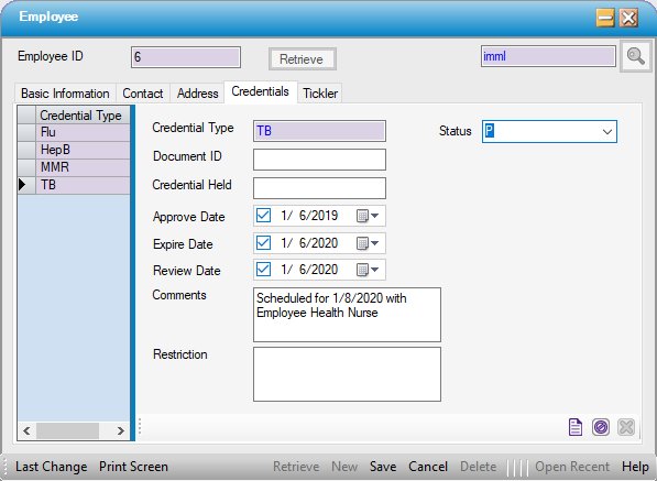 The Credentialing tab of the Employee form can be utilized to track many aspects of employment: