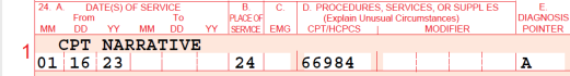 CPT Narrative can be entered to provide a description of unspecified codes for Professionally formatted claims. Data entered here will appear in the shaded portion of section 24A of the CMS 1500 claim form.