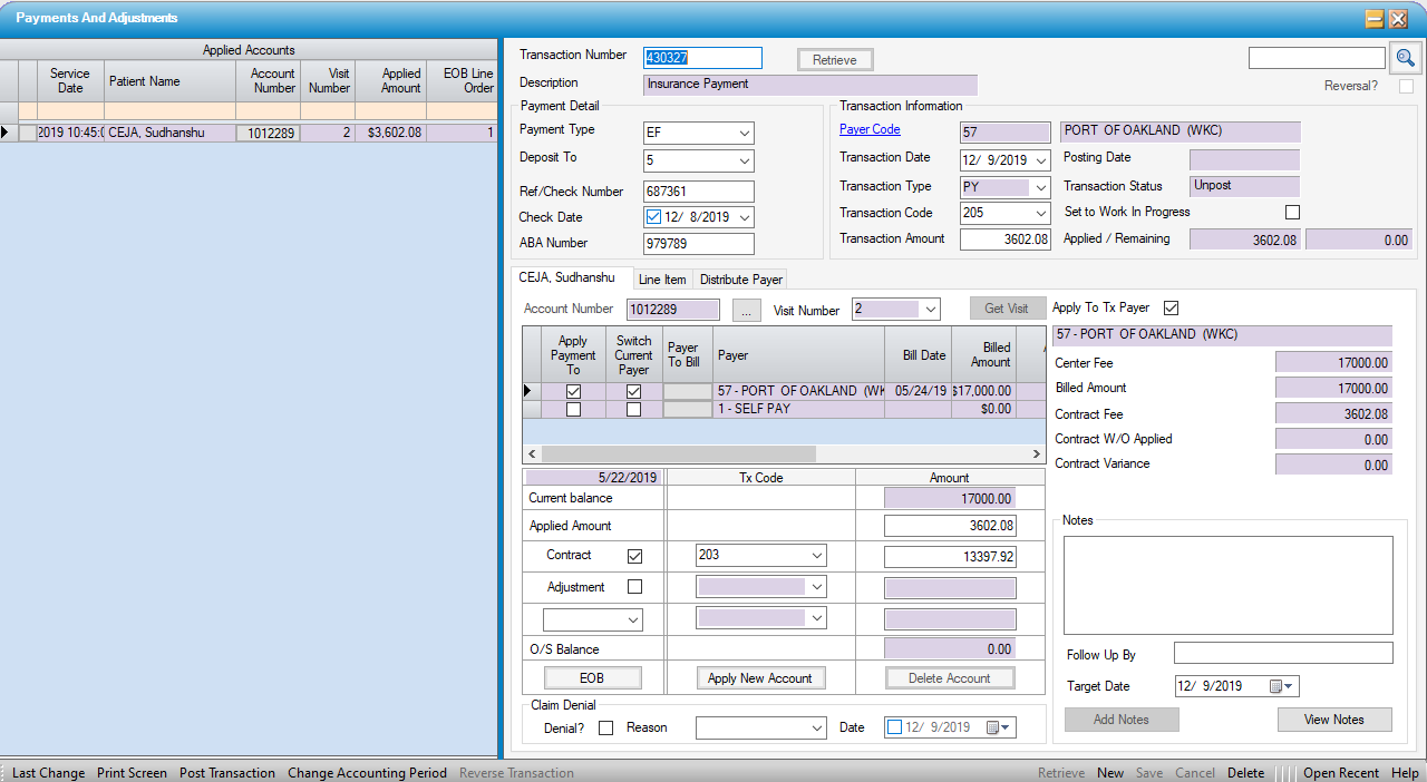 For centers that practice Line Item Payment Posting, begin by entering the total payment and contractual write-off (if not previously applied) on the Patient account tab of the Payments And Adjustments form.