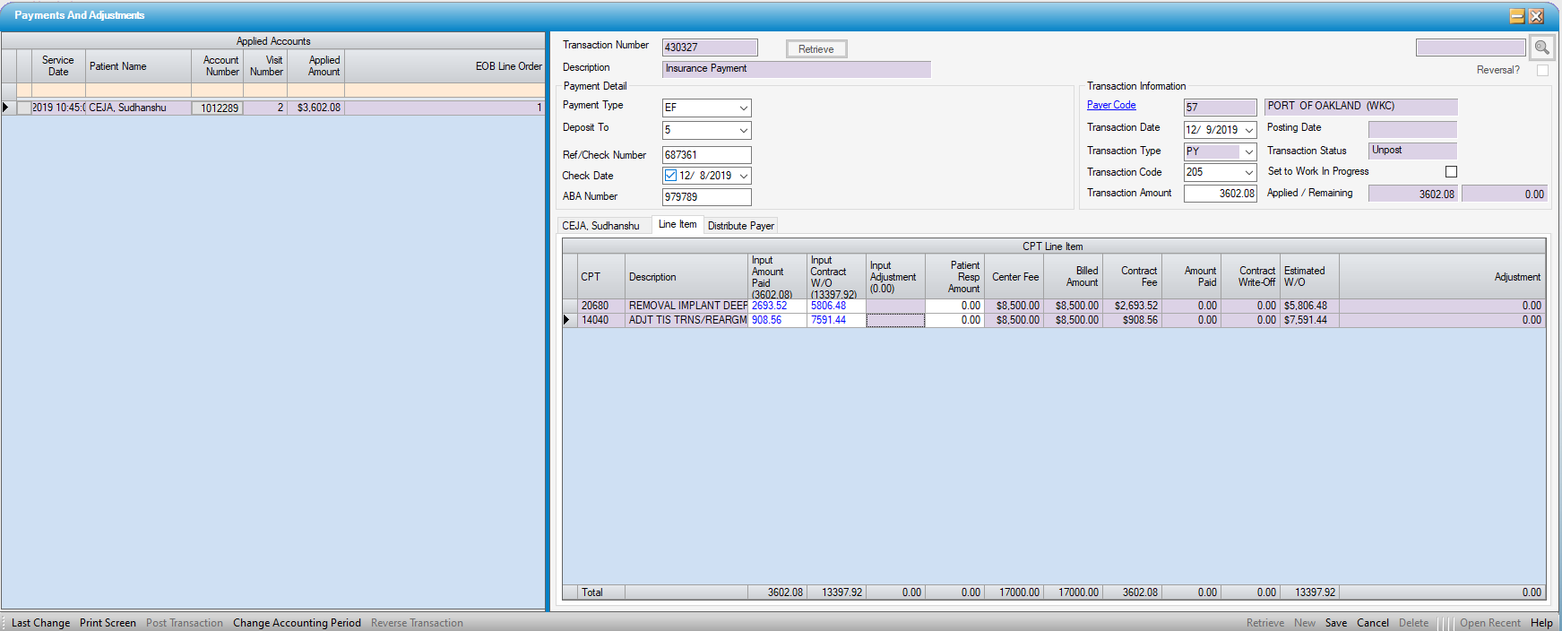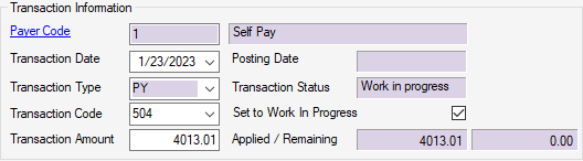 Once charges have been entered, return to the Payments And Adjustments form, uncheck the Set to Work In Progress box, and perform the line item posting, then post the payment. (Reports run by Transaction Date can be used to reconcile the payment entered to the date it was received. The line item posting, however, will be reflected on the date posted.)