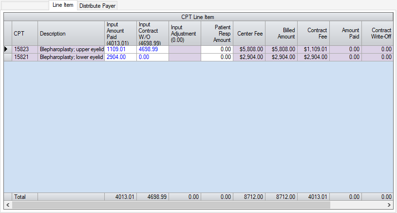 Once the total amount of the payment and/or contractual write-off have been entered, select the Line Item tab. On this tab, both the payment and the contractual write-off can be broken down and entered for each individual CPT code (aka: line item).