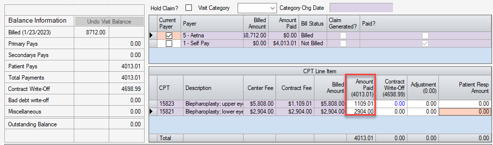 NOTE: Once the balance on the visit has been switched to SELF PAY FOR BILLING, that balance will override any amount remaining in the Patient Resp Amount column.