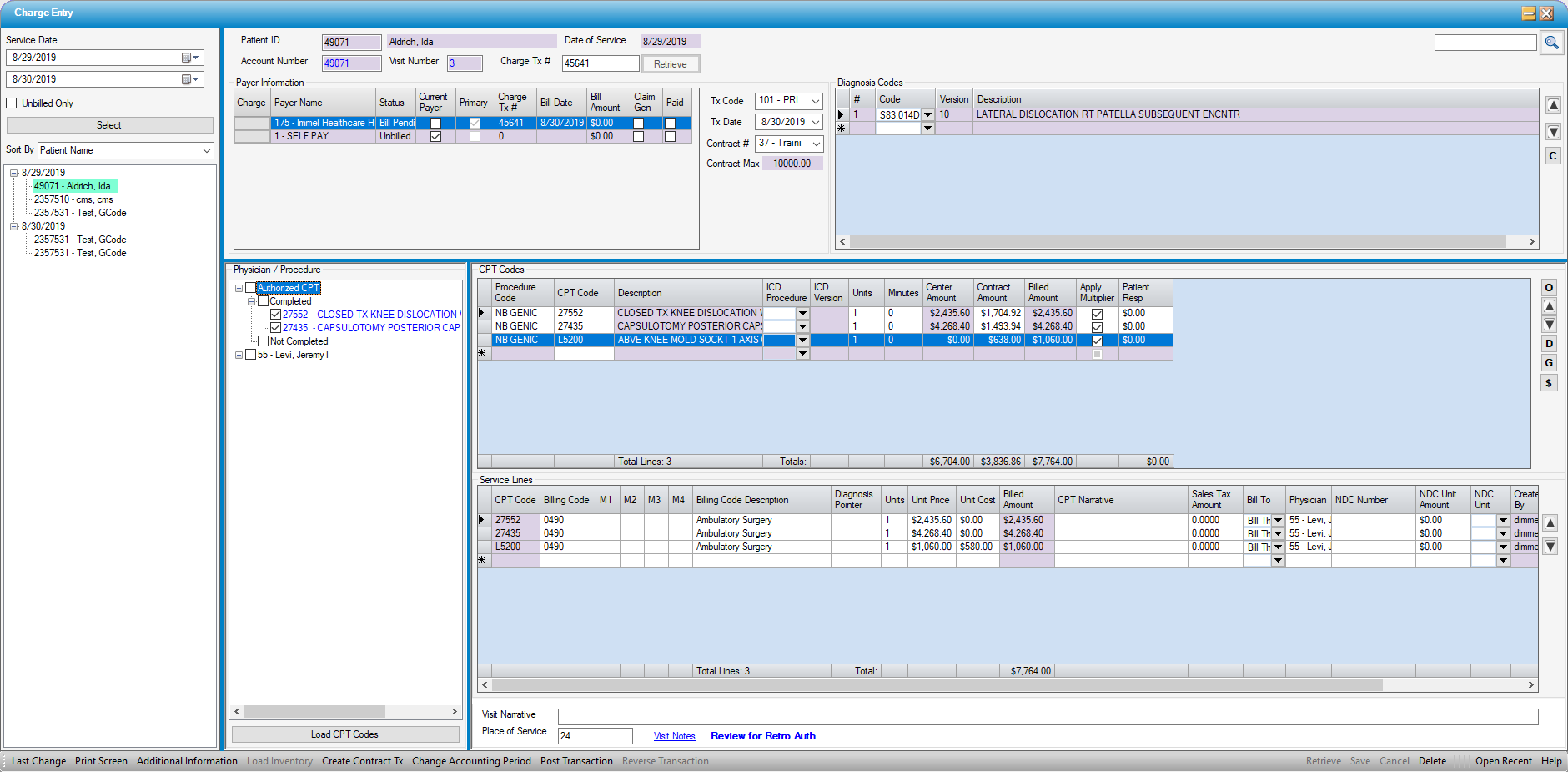 - When the patient is selected, the Physician/Procedure pane will populate with Authorized CPT Codes (if entered), the Physician, Procedure, and any CPT codes attached to the Procedure in Procedure Configuration.