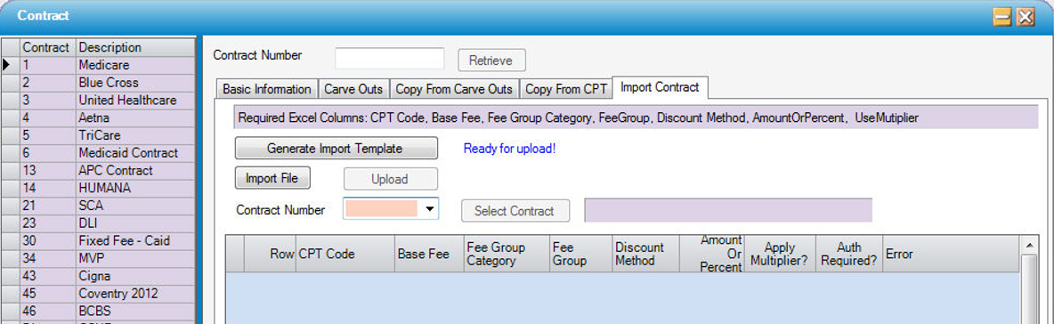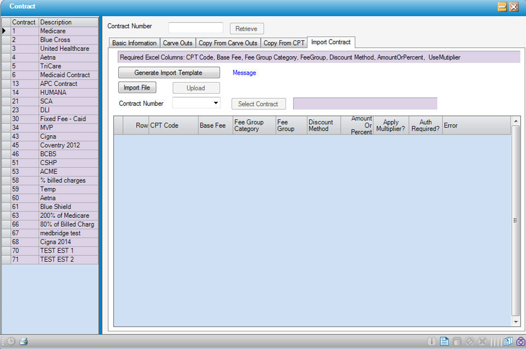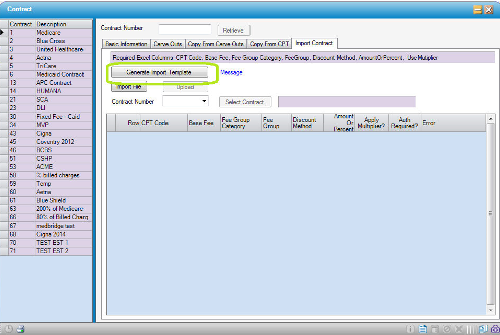 Clicking this button will generate the template needed to import contracts. This template is in a spreadsheet format that requires CPT Code, Base Fee, Fee Group Category, Fee Group, Discount Method, Amount or Percentage, and (Y/N) Multipliers.
