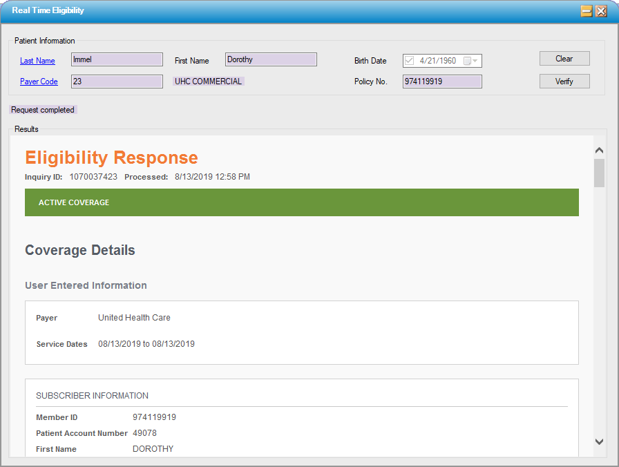 •When the Verify function is selected in Registration > Insurance, the HTML response from Waystar will be displayed and saved to the Benefits Information section (formerly labeled Verification History) of the Payer Information tab. (The file will be retained whether or not a favorable response was received.)