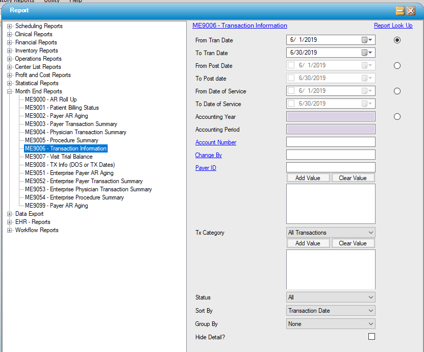 • Enter desired Transaction Date range, Date of Service range or Accounting Year and Period.