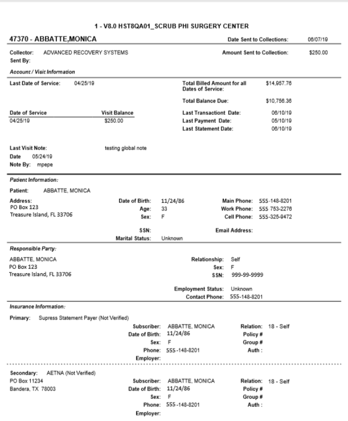 Full ledger for accounts sent to Collections. The report includes detailed patient demographic and financial information, and can be used to send appropriate information to the collection agency or for internal follow-up. Prints a new page for each patient.