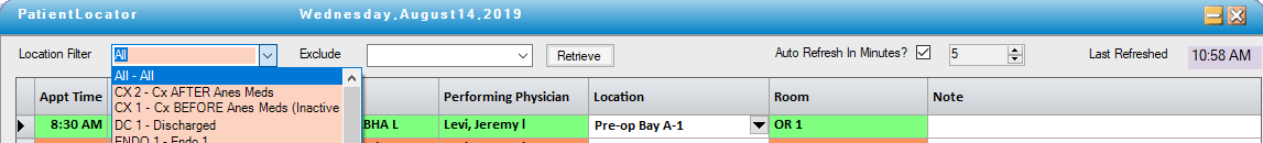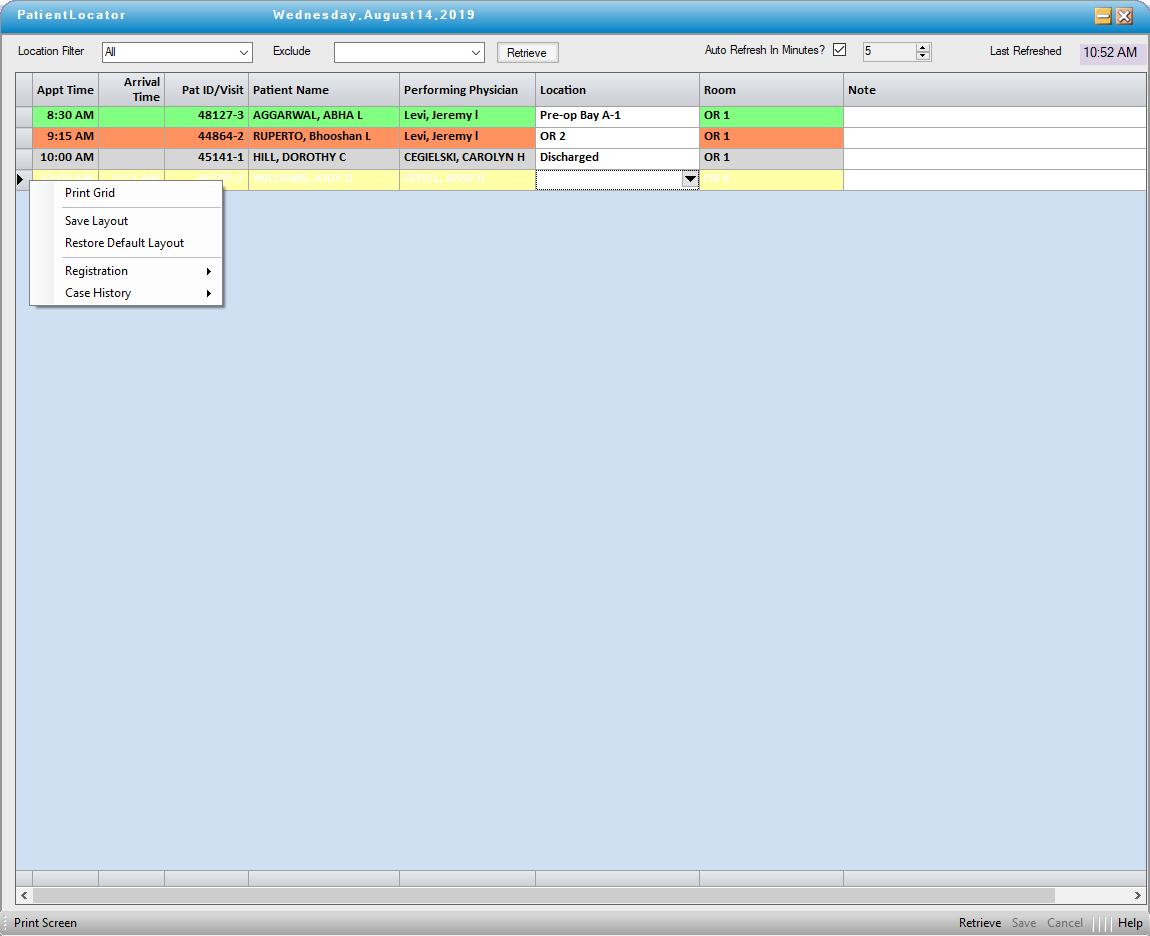 The Patient Locator allows facilities to track patients' progress as they move through the stages of care Different colors may be assigned to each phase of care so that all staff members can see at a glance the progress of an individual patient or the day's cases.