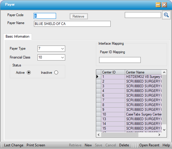 If Standardize Payer Code was selected in Administration > Configuration > Enterprise Configuration, Payers will be created on this form and Payer Configuration will be performed at the center level on a separate form.