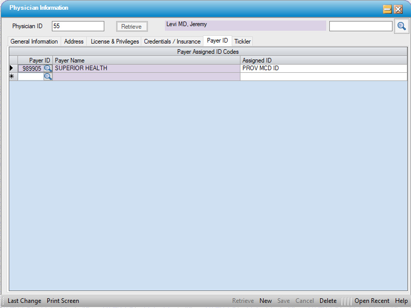 Each payer may assign an ID to a physician for billing purposes.  If the payer requires that this ID appear on their claim forms, it needs to be entered on this tab in the Physician Profile.