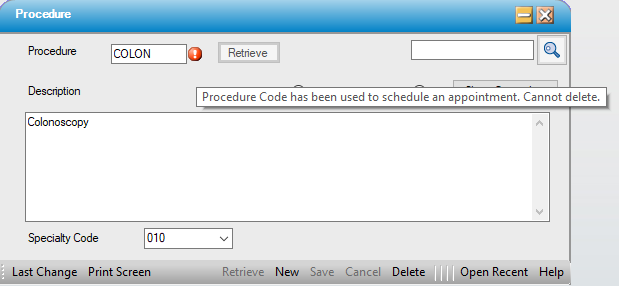 NOTE: It is not possible to Delete a Procedure Code that has been used. The system will generate an error ball with a hover message explaining why the Procedure cannot be deleted. Procedures that have been used should be Inactivated instead.