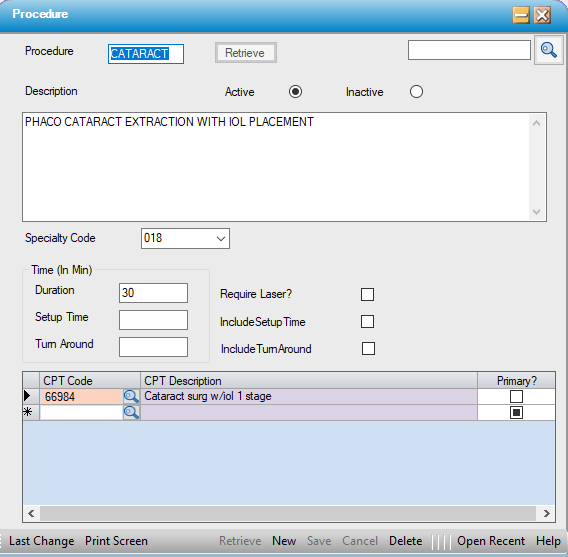 Procedures is where the procedures specific to a center or organization are defined Procedures can be created, deleted, or inactivated via this form.