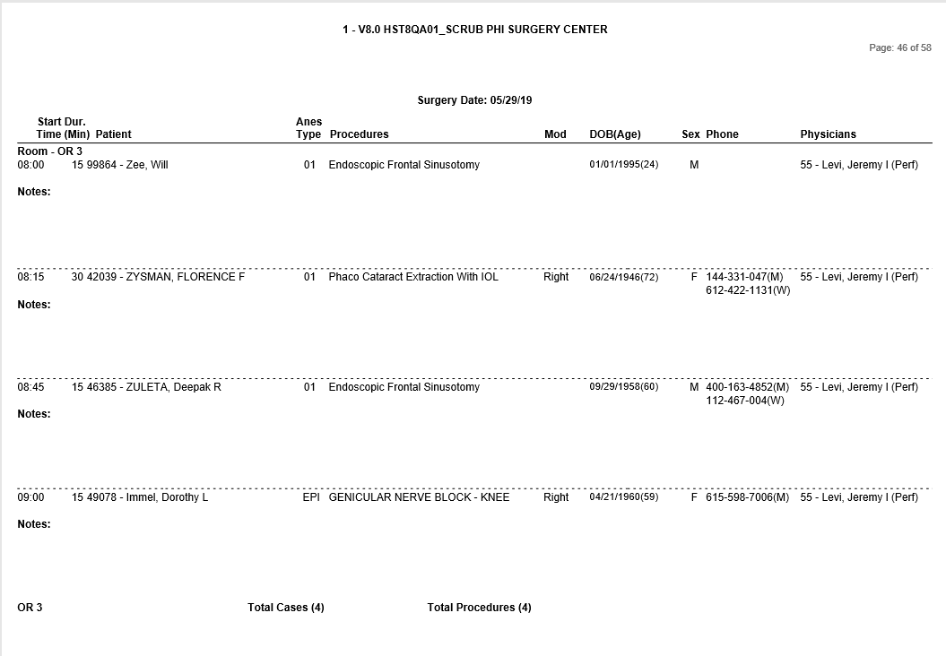 Tracks visit Appointments within the specified schedule date range. Visit appointments are associated with appointment types defined in Appointment Type Configuration to require a patient visit (appointment type SRGY is the default). Includes Appointment Notes. A new page will print for each date of service selected; This report can be generated so each room is started on a new page – see Group option below.