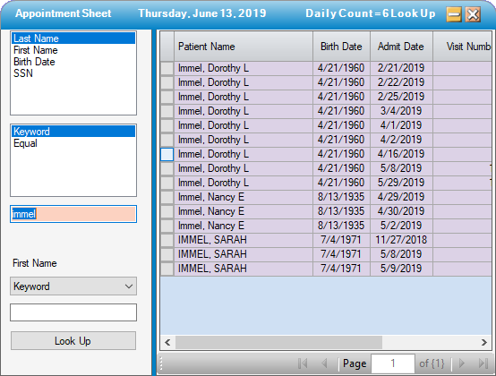 Use the Appointment Look Up, type the last name, or part of the last name into the box, and press Enter or click on "Last Name". The Look Up will appear with matching choices displayed. Click on the desired patient and the appointment sheet will display the patient's appointment date and time.