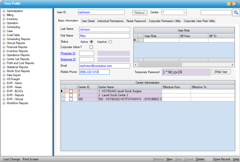 • An e-mail must be entered for the User on the Basic Information tab in order to use the EMail User button. Click the Email User button to e-mail the temporary password to the Email saved in the User Profile.