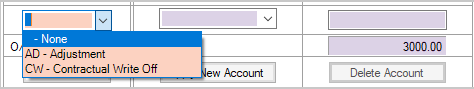 If an additional Contractual Write Off is required, select CW - Contractual Write Off from the drop down on the third adjustment line, enter the appropriate Tx Code, and enter the amount to be written off.